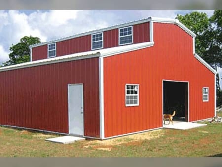 This Guardian is a 36′ x 40′ x 12′ Barn Style with a personnel door and roll up door with 8 windows. The color is rustic red with polar white trim.